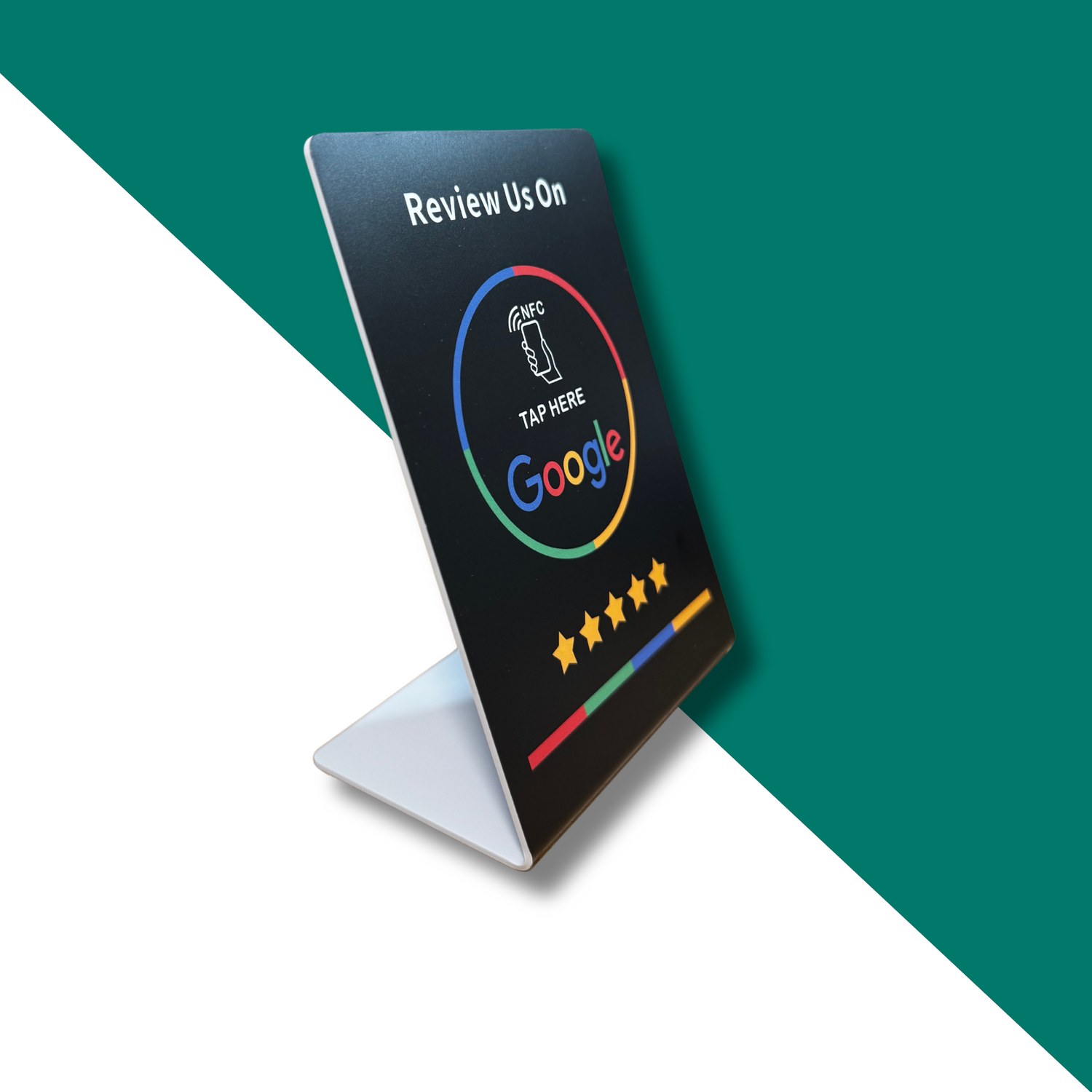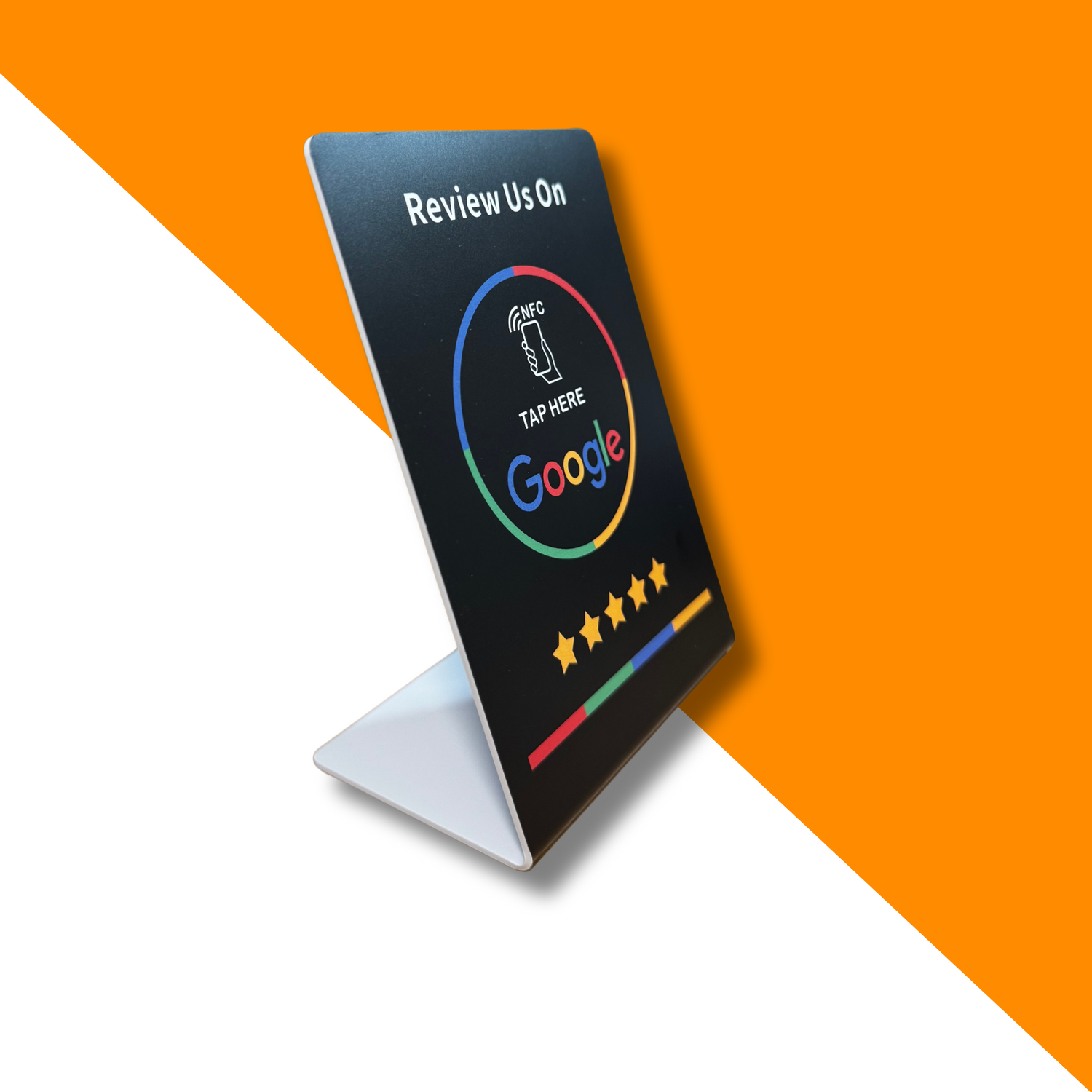 VumaTap uses NFC technology. When customers tap their NFC-enabled phone against the VumaTap stand, it opens your Google review page instantly, making it easy to leave feedback.
